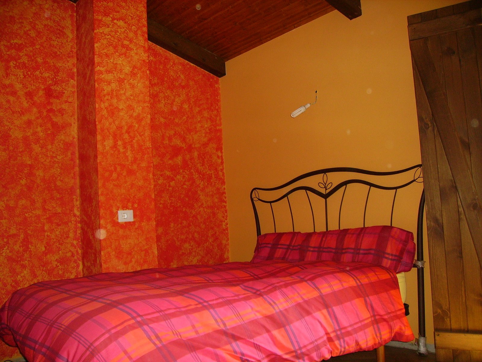 Pintada con fondo de pintura plástica naranja y veladura en dos paredes roja aplicada con un trozo de colchón de espuma a falta de una esponja decente, aún así ha quedado preciosa. Tuvimos suerte de estar atentos y no pintar todo con la veladura roja porque hubiera ahogado la habitación.